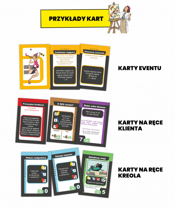 W zależności od wybranej strony, gracze mają do dyspozycji różny zakres kart - co zapewnia nieliniowość. Ręka Klienta składa się z kart Inwestorów, Reklamacji (potężnej broni!) i Zamówień. Kreol broni się kartami Pracowników i Produkcji.