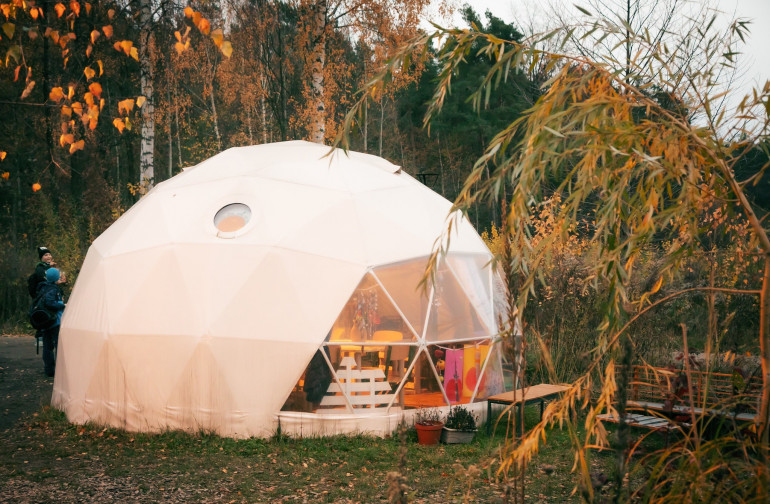 Zebrane środki chcemy w całości przeznaczyć na dofinansowanie zakupu namiotu sferycznego. Przykładowe zdjęcie namiotów z Leśnego Przedszkola Puszczyk w Białymstoku: