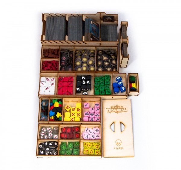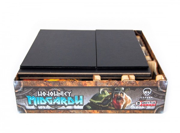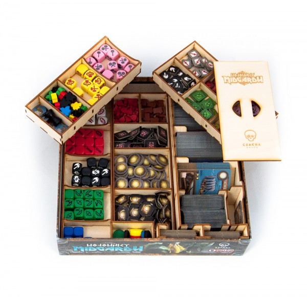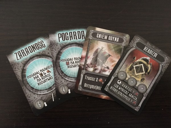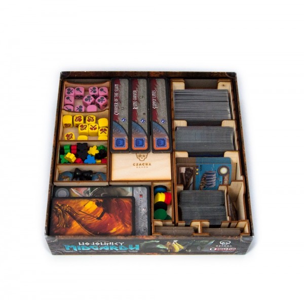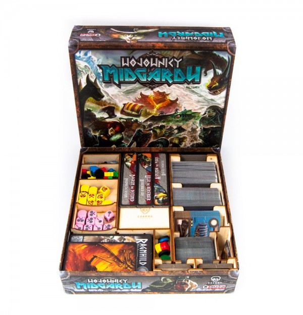 Wewnątrz pudełka znajdziecie sporych rozmiarów planszę, na której prowadzona jest rozgrywka. Jest też sporo kart potworów różnej maści: Trolle, Draugry, Smoki i inne. Będziecie mogli również wykuwać runy oraz wypełniać różne przepowiednie, których działanie opisane zostało na odpowiednich kartach. Każdy bohater posiada swoją własną kartę z unikalną umiejętnością. Prócz tego w pudełku znajdziecie również mnóstwo żetonów, drewnianych znaczników żywności i drewna, znaczniki graczy oraz grube kafelki statków do podróżowania w odległe miejsca. Są też kostki, a w zasadzie cała ich masa - reprezentują one wojowników i są podzielone na trzy kolory: biały (fechmistrz), czerwony (włócznik) i czarny (topornik). Ilość elementów gry robi spore wrażenie, a ich wykonanie stoi na najwyższym poziomie.