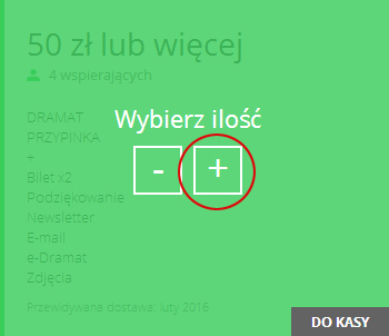 + Bilet x4, Podziękowanie, Newsletter, E-mail, e-Dramat, Zdjęcia, Dramat, Przypinka, Zakładka, Pocztówka, Plakat, Video podziękowanie, DVD, Kubek, Koszulka, Sponsor, Udział w próbie